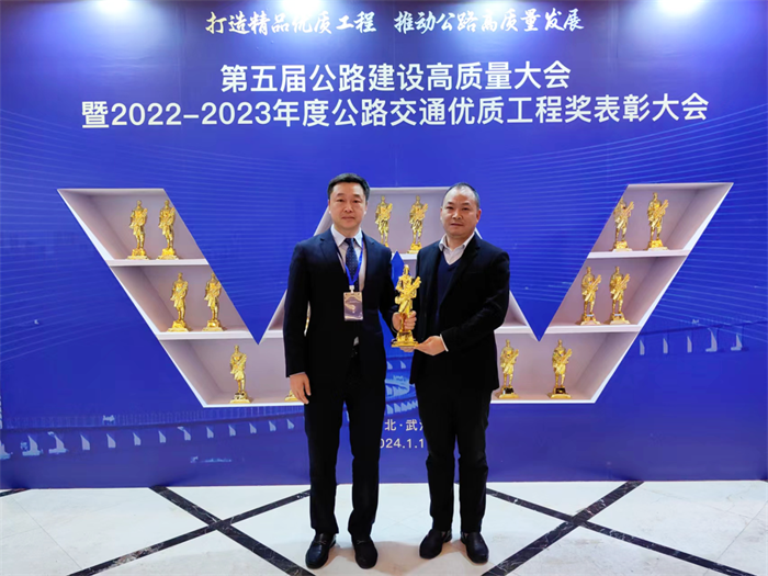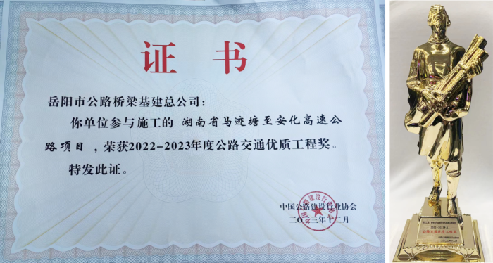 岳阳路桥集团参建的湖南马安高速公路工程,作为2022~2023年度(第一批)公路交通优质工程奖(“李春奖”)获奖项目,喜获大会表彰,公司荣誉室再添一座国奖金杯;公司参与该项目实施的主要负责人王观次、李亮义、丁伟光三人获评“优秀项目建设者”荣誉称号。