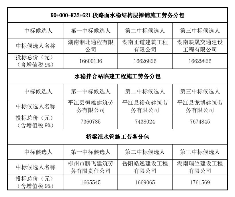 岳阳路桥集团有限公司湖南省桂新高速公路桂阳至新田(宁远)段总包部于2025年10月31日9:00 (北京时间,下同)在岳阳路桥集团有限公司六楼对K0+000-K32+621段路面水稳结构层摊铺、水稳拌合站临建工程、桥梁泄水管施工劳务分包进行了公开开标、封闭评标;在集团公司成本管理部、工程质管部、纪检监察部、三分公司纪检委员全过程监督下,评标委员会按照招标文件确定的评标办法进行了细致的评审,并推荐中标候选人排名如下: