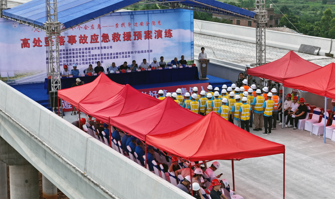 安全是企业高质量发展的生命线。为贯彻“人人讲安全,个个会应急——查找身边安全隐患”安全生产月主题思想,进一步提高工程项目建设应对突发事件的快速反应能力、应急处置能力和协同作战能力,防范和高效处置施工中发生的高处坠落事故,筑牢安全生产防线,7月2日,岳阳路桥集团联合湖南省桂新高速公路建设开发有限公司,在湖南省桂新高速公路第三合同段项目举办高处坠落事故应急救援演练。项目属地相关部门、各参建单位现场观摩演练,岳阳路桥集团党委副书记、总经理袁雪翔作演练动员讲话,湖南省桂新高速开发有限公司董事长鲁云岗、总经理曾永旺出席活动并作讲评。